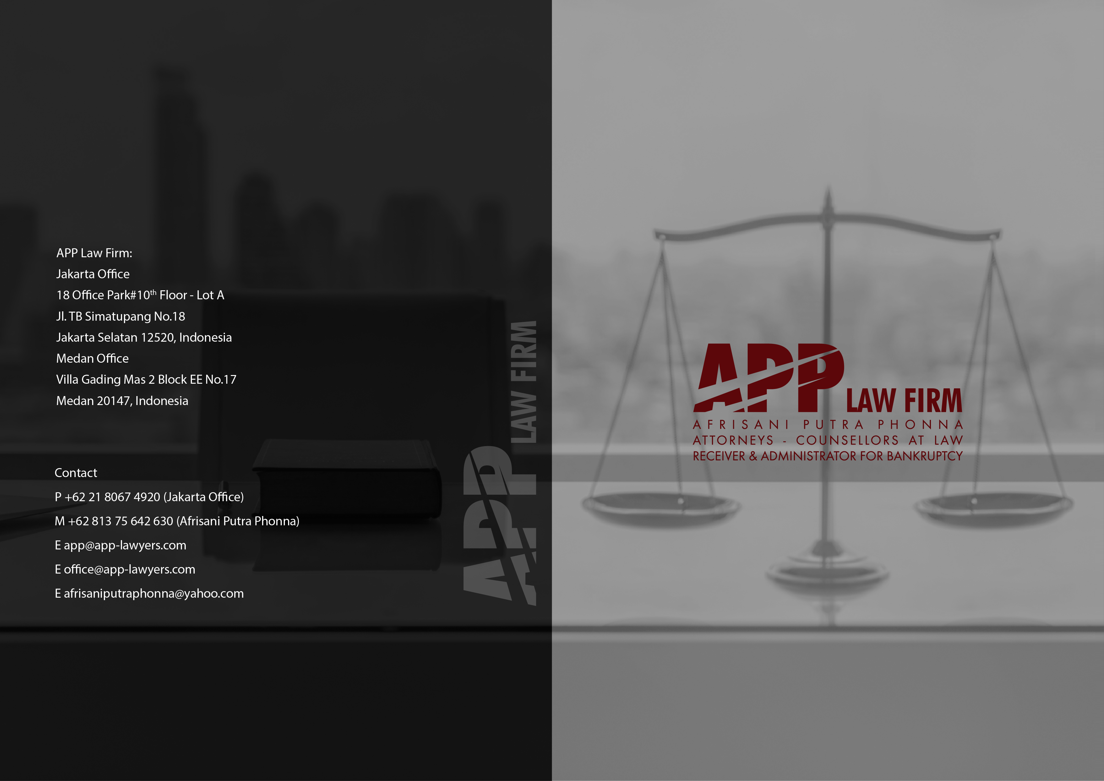 Afrisani Putra Phonna Law Firm (APP Law Firm) adalah sebuah kantor hukum yang didirikan oleh Afrisani Putra Phonna S.H., dimana pendirian kantor ini merupakan aktualisasi dari visi dari pendiri untuk membangun suatu firma hukum yang kompeten dan independen guna menegakkan supremasi hukum di Negara Kesatuan Republik Indonesia yang secara profesional memberikan layanan jasa hukum baik bagi kepentingan perusahaan maupun perorangan dengan ruang lingkup pemberian jasa hukum yang meliputi bidang litigasi dan non-litigasi. Kantor Hukum yang kami didirikan untuk memenuhi kebutuhan jasa hukum yang profesional dengan memaksim . . .